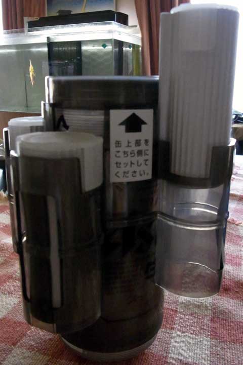 市販の速攻冷やし機は、単純に氷りを用います。おわかりのように、これでは、どうあがいても0℃を下回る事はありませんよね。で、問題のアサヒ製冷却器は、冷やすのに専用のアルミボディーの筒を4本用います。この筒の中に結構な濃度の食塩水(水200ccに対して塩15cc)を入れ、24時間以上冷却した物を使用します。