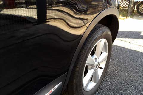 入りたい駐車場の入り口がトラックでふさがれてたんですが、少し動いて鼻先が入るだけの余裕が出来たんです。よしよし、ということで入っていき、頭はすんなり通過。左にハンドルを切り始めた矢先『ゴーッツ、バキバキッ!』という音と共に左後方から大きな異音が(爆)・・・。バックミラーを見れば、リアフェンダーのリップ部分にある樹脂プロテクターがプランプランしてるではありませんかっ!