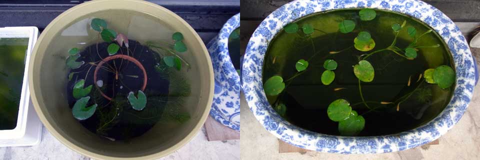 はい、左側がリセットした睡蓮鉢二号です。綺麗になりました。メダカ達も喜んでいる事でしょう??。因みに、リセット前の写真は撮る気になれず記録してません(笑)。不思議だったのは、マツモの成長が著しかった事ですね。同時にマツモが苔に覆われていなかったので凄く綺麗でもありました。ん~ん、要考察です。 で、右側が睡蓮鉢一号。こいつはそのままの状態です。鉢の内側に藻の類いが生えてる所為で緑な感じに見えますが、水の透明度はリセットした睡蓮鉢とそれほど変わりません。まぁ、後問題なのは一番左にチョロッと写ってる赤ちゃんメダカが入ってる発泡ウレタン容器ですかね。これも緑化が著しくて、リセットした睡蓮鉢のように怪しい感じの水質ではないのでこのままにしてますが、もう少しメダカが大きくなって来たら掃除予定です(今だと小さいのを全部拾えないだろうし、死んじゃうかもしれないんで)。