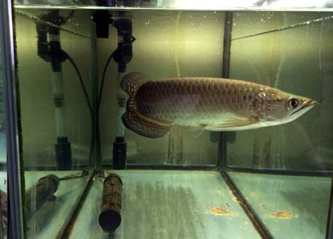大食漢なんですが、食べ方に少々問題がありまして・・・。口に入れた餌の半分程度は租借だけして吐き出してしまうんです(これでも除去したんですが、右下に残留物が溜まってます)。その所為で、週末には水に色が付いてしまい(餌の色素?でしょうか)、残って溜まった餌が腐敗してしまっているんですね。30cm程度になったら120cm水槽に移動予定なので、それまでの辛抱なのですが・・・。
