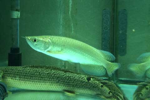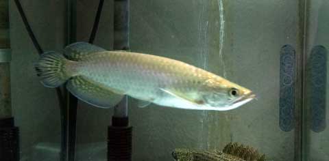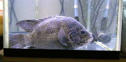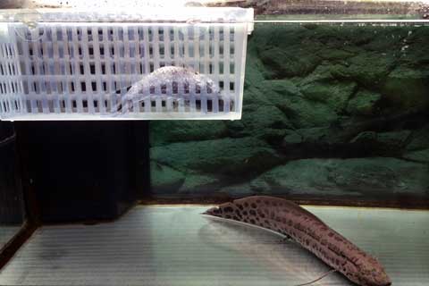 餌が上手く食べられないようなので、窮屈に見えますが(テキサスと同じように)カゴに入れる事にしました。カゴに入れるなら・・・ということで、肺魚の水槽に移動しました。