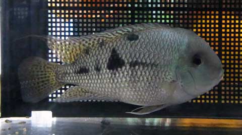 現在20cm弱です。顔は青くて体がオレンジ系の色で結構綺麗なんですが、海水魚のようなハッキリした発色ではないので、判り辛いでしょうか??