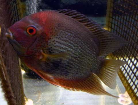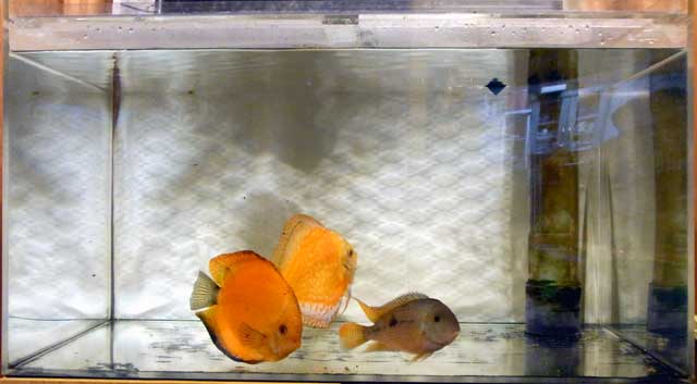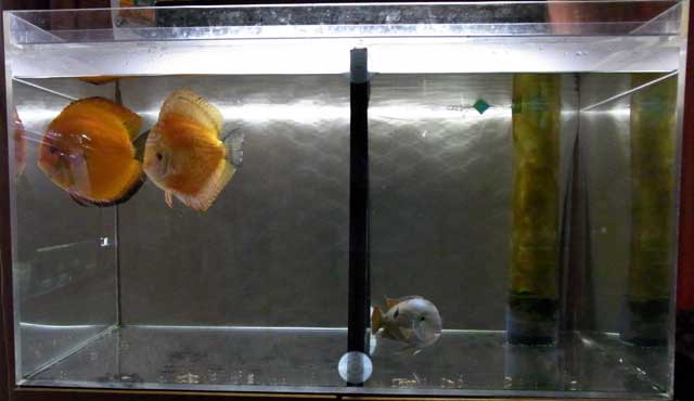 セパレーターを取ったばかりの頃は、たま~に、ニカラグエンセがディスカスを威嚇する程度だったんですが、1週間過ぎたあたりから、威嚇から攻撃に変わってしまい、ディスカスが餌を食べられないわ端に追いやられて脅えている・・・という具合になってしまったので。。。