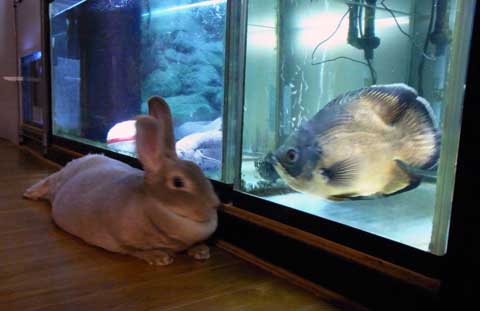 ウチの兎、水槽の前でこのようにグデっと寝そべる事があるんです。お互いに見合うこともしばしば。オスカーの方が攻撃的で、戦いを挑むんです。肺魚とも見合う事があるんですが、何事も無くジーッとそのまま睨めっこが続くだけ(笑)