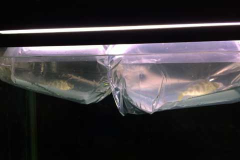 餌が上手く食べられないようなので、窮屈に見えますが(テキサスと同じように)カゴに入れる事にしました。カゴに入れるなら・・・ということで、肺魚の水槽に移動しました。