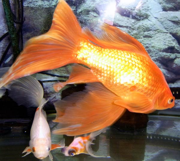 で、この鰭が長い3匹組は、実は狙って購入した子達ではありません。じゃーなーに?っていうと・・・・・。以前は「生き餌」しか食べない魚を飼っており(生き餌とは”金魚”だったり”どぜう”だったり”えび”だったり”虫”だったりするわけですが)、その餌用金魚の中から特に、尾鰭が長かったり、キャリコだったり、殆ど真っ白だったりということで、選んで育ててみただけなんです。元の価格は1匹10円(爆)。