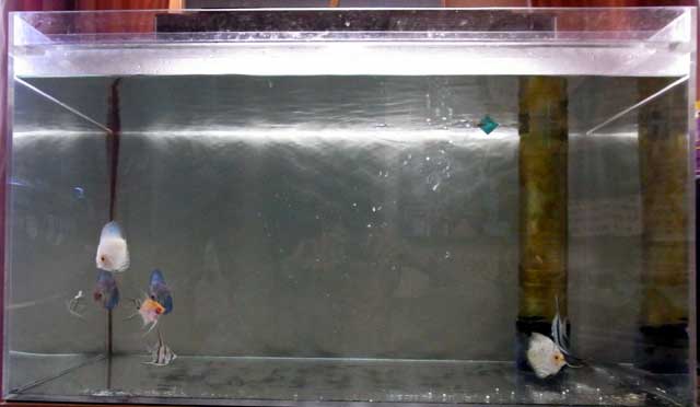 合計8匹で、エンゼル・ディスカス共に4匹ずつという内訳です。成魚になった時、水槽の大きさに対する魚の数でいえば少々オーバーしているというのが一般論なんですが、エンゼルはディスカスほど大きくはならない(筈な)ので、これで行く事にしました(笑)
