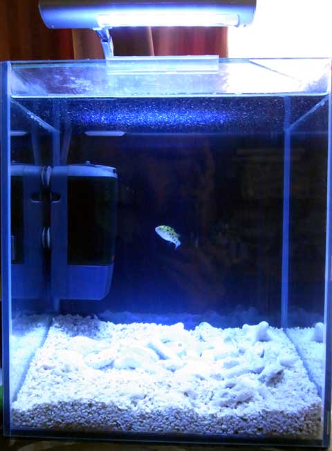 あ、ミドリフグに話を戻しますが、こいつはMax.7cm程度まで成長します。この水槽では少々役不足ですが、まぁ何とかなるでしょう。。。成長するにつれ、塩分濃度を上げていますので(今は海水の濃度の2/3くらいにしてます)、海水と同じ塩分にしたら、ハゼか何か入れようと思ってます。