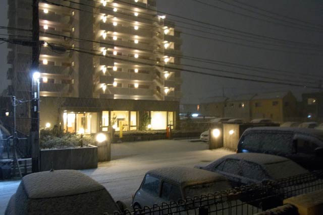 で、先日は関東一円で雪が降りましたね。関東の中では結構南(つーか西か?)に位置していて海も近い我が家ではありますが、しっかりと降りました。写真では降っている雪までよく見えないですけど、所謂本降りの状態でしたね(写ってるマンションは、ウチの裏のマンションです)。