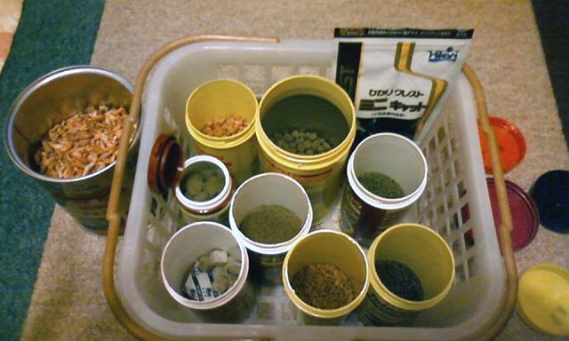 何故こんなに!?と、疑問も湧きましょうが、食性やら何らでこうなってしまっています。そう、ウチの場合は結果系なんです。よく、「○△用魚の餌」と銘打って種類豊富に各社それぞれ餌を出していますが、各魚用に売られている餌を、対象の魚が必ずしも好んで食べてくれる訳では無いんですよ~。