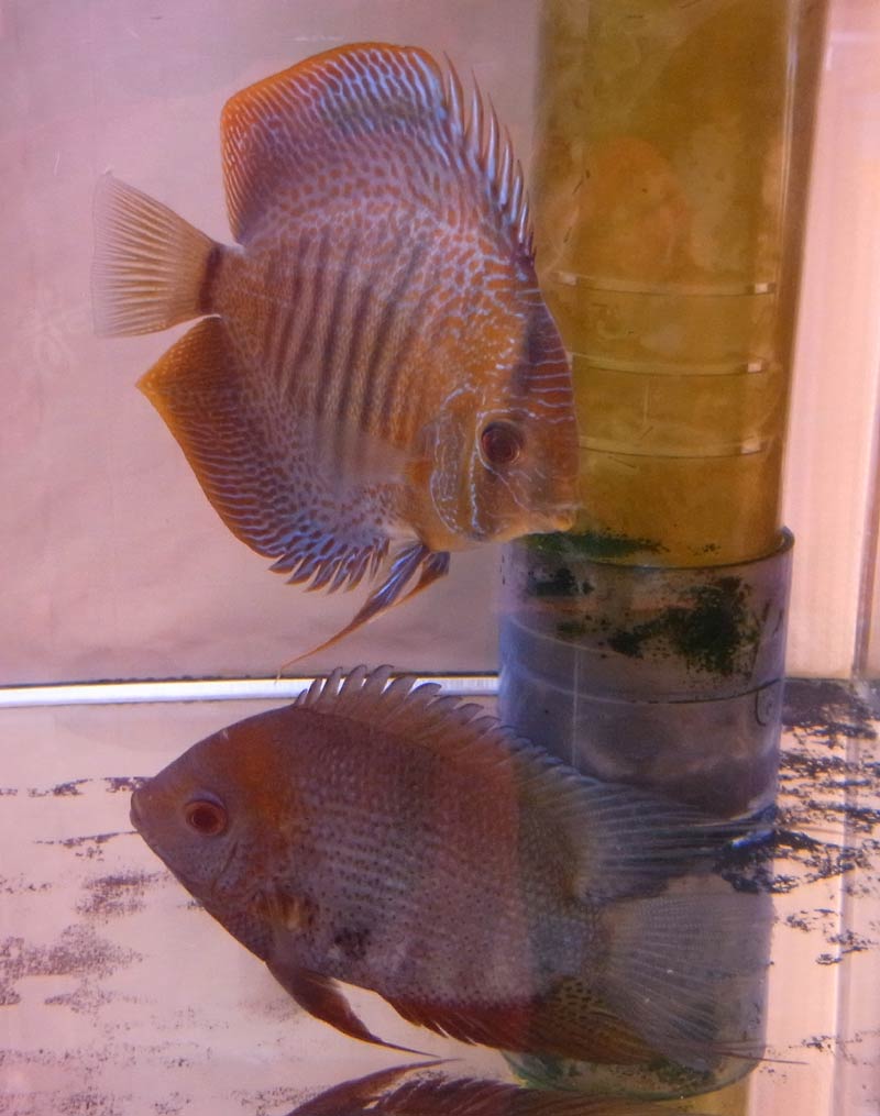 ブルーデンプシーと混泳させていたセベラムを、ディスカス水槽に移したんです。理由は、セベラムに怪我が絶えなかったからです。ケンカ自体は激しい物で はなかったんですが、2匹共それなりに成長したおかげで(60cm水槽では狭くて)全力で泳ぐと彼方此方にぶつかってしまって・・・という感じだったので。