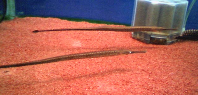 パイプフィッシュって、タツノオトシゴの仲間なんです。口が尖っていて細長くて、「る」の字に身体が曲がっていたら、そっくりでしょ?日本名では楊枝魚と言って、河口付近にいるようです。、写真のは淡水でも飼育可能なんですが、多くは汽水(半海水)での飼育の方が良いみたいです。