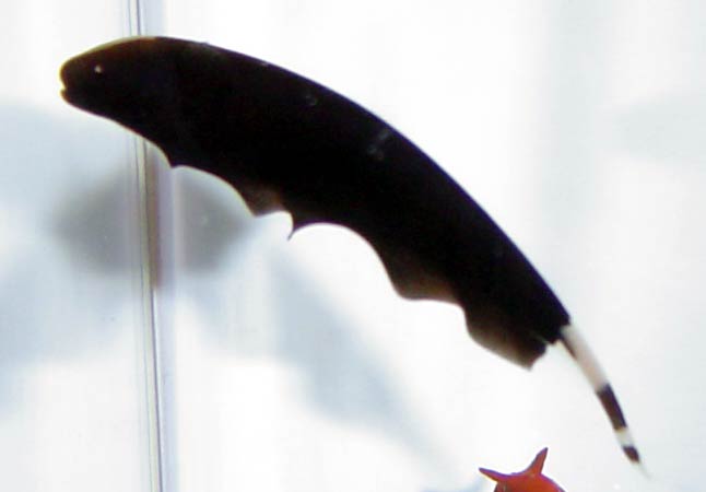 背中に鰭はなく、お腹側に長い鰭があるだけです。左の小さい点が目です(退化してて使い物にはなってないらしい)。休む時は、まるで死んでしまっているかのうように、横になってしまうんです!