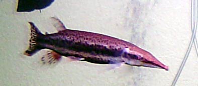 で、ウチで飼ってたこの子も、見事に生き餌しか食べませんでした。しかし、凄く臆病(警戒心が強い)という種類です。体型の通り、とても早く泳ぐ事が出来、ビックリしてパニックになると、水槽の4面と衝突して大変でした(ウチは平気でしたが、口が骨折してしまう場合もあるんだとか)。最終的には30cmくらいになりました。でも・・・でもですね、この餌の所為で金銭的に負担が厳しくなり(実はもう一種類、生き餌しか食べてくれないヤツを飼ってたんで)、なくなくドナドナ(ショップに引き取って貰いました)したんです。金がないなら最初から飼うな!と罵倒されれば其れまでなんですが。。。。。