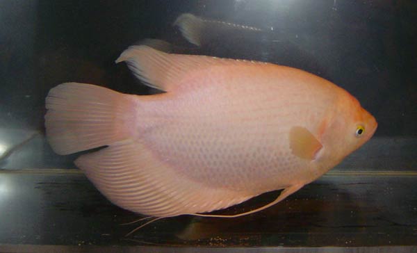 あ、この魚について少々説明しておきましょう。冒頭言った様に大型の魚なんですが、グラミーという種類の殆どは、小~中型(15cmが関の山ってところです)。アナバスという括りになり、鰓の中にラビリンス構造の器官を持っていて、空気から直接呼吸する事が出来るんです。有名な魚で言えば、ベタ(コップなんかに入れられてるのを良く見る、赤や青が鮮やかな魚)。水中酸素量が少々低くても生きていけてしまうということで、止水環境でも飼育可能。且つ、成長が早く餌のえり好みも激しくないということから、現産地等では、食用魚として養殖されているんです。ベトナムなんかでは普通に、コイの丸揚げ甘煮あんかけ風料理の、コイの代わりになっています。最後に、いつか言った様に、大きくなる魚の常として、幼魚(5~10cm)サイズでは数百円で売られてます。