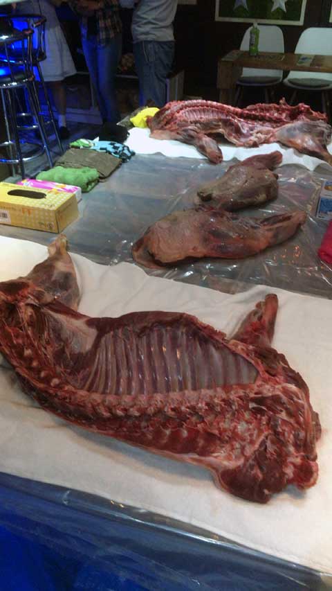 イノシシやら鹿やらの肉を食いながら呑むんだろうな位のつもりで馳せ参じた訳ですが、店の中に入って一寸フリーズ。。。店内中央にドドーンと肉塊が置かれているじゃありませんか。
