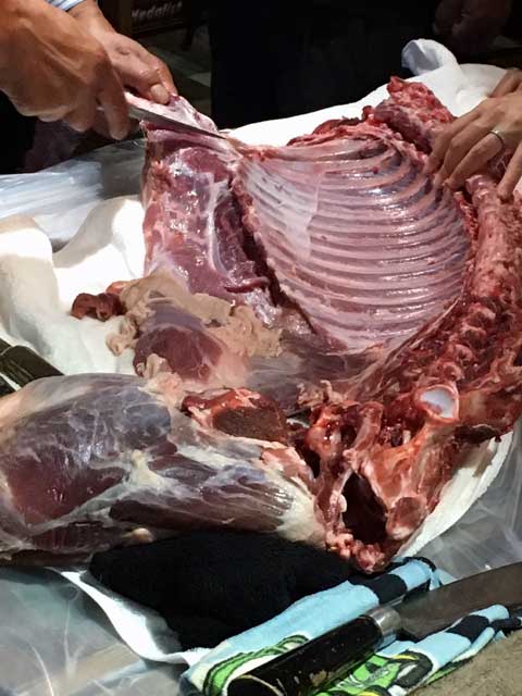 飛びついたのはコレを目的に来ていた方々数名でしたが、なかなか最後まで終わらなかったのと、せっかくだしという思いから自分も肋骨を切り取る作業をしてみました。感想は・・・いやこれが、なかなかどうして脂で滑ってやり辛かったんですよ。用意されていた肉は数ヶ月前に狩ったものとのことで季節的に脂がのってないと言っていましたが、それでもヌルヌルでやり辛かったですよ。あとは、包丁ですかね。ご多分に漏れず、ちゃんと磨いだ刃じゃないとやってられません。