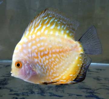 マリンブルーと言います(最近の品種?)。本来は濃いめのベタ青系かと思うのですが、柄も見えるし縞も薄らあります(何が正解かは知りませんが(爆))。自分の好みで、なるべく柄や縞が目立たない子を選んできました。しかし小さい(500円玉サイズ)。。。苛められずに育ってくれる事を願います。