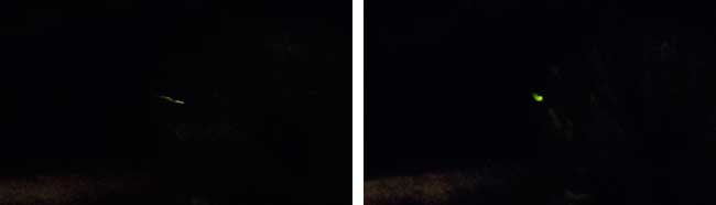 左側、人魂的ではありますが飛んで移動中の所。右側は止まっている所だったんですが、点滅のタイミングと合わせるだけで精一杯でブレブレでした(汗)。なにせ明かりが無い中で撮っているので・・・(シャッターが下りるギリギリの明るさでした)。