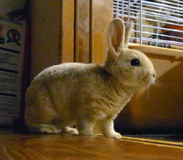 ミニレッキスとは、純血種ではありません。レッキスとネザーランドとの掛け合わせとのことなんですが、毛並みや髭はレッキスそのものです(毛並みはVELVETのようで、髭は真っ直ぐでは無く縮れてるんです)。驚いたのは、すげー餌を食べる事でしょうか。まるでロップイヤー並(汗)。状態確認のため、いきつけの動物病院で健康診断してもらった時に聞いたら『レッキスはロップよりも食うかも(笑)』とのことでした。あ、健康状態にも問題無くて一安心です。体重は340gでした。