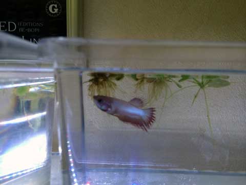 漏れていた水をそれなりに(爆)処理して、フィルターを掃除して・・・1.5時間程度だったでしょうか。新入り君を水温あわせしてる間、風呂に入っていたのに一汗かいてしまったので、再度シャワーを浴びるハメになりました(笑)