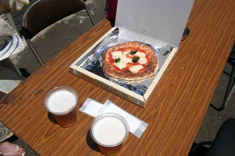 1枚500円だったピザ。焼きたてをその場で!当然、ビールも!