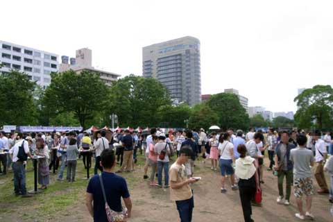 写真中央の奥では、シートを敷いて地べたに座ってる人達がまったりな感じでした。晴れてればこそですね。雨じゃ洒落になってません(爆) 左手前に見える立ち飲み用のテーブルもあり、これもありかなぁ、という感じでした。