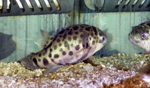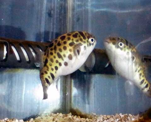 自分は水槽の水を排水するのに、主に手動ポンプ(醤油スルスルの先っぽにラッパが付いている物)を使っています(地べたに置いている90cmと60cm水槽は、高低差なさ過ぎて排水速度が遅いので電動ポンプを使っています)。いつもなら、このラッパを避けて逃げ回るフグなのですが、この日はジッとしている事が多く、気が付いたら吸い込み口で蓋代わりになっていました(@_@) 見る見る内に丸く膨らみ、棘まで出てきました!。ツルンとしてるフグなので、棘なんて持っているのかぁ・・・と、思わず驚きましたよ(汗)。