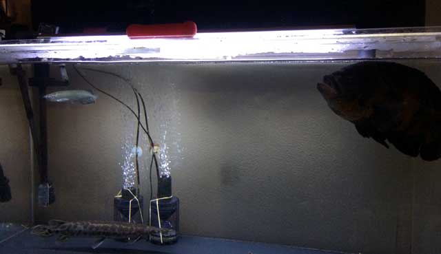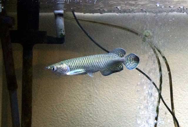 『ノーザンバラムンディー』という種類です。オーストラリアとかに生息してます。体型はアジアアロワナとそっくりで同属なのですが、アジアアロワナの様に赤や青の派手な色彩による(ディスカスみたいな)派生はありません。が、お値段がアジアアロワナの1/3~1/4という非常にリーズナブルな所が購入に至った最大の決め手です(爆)。