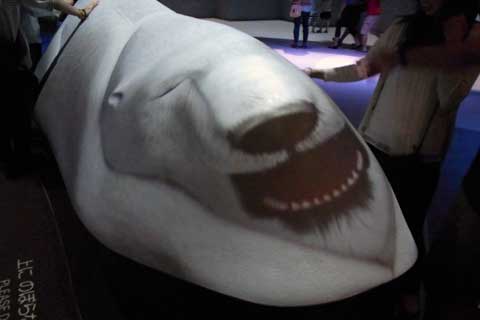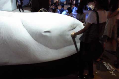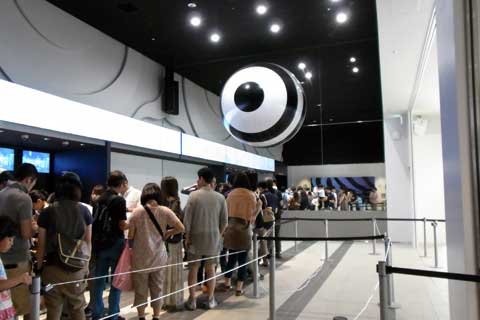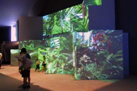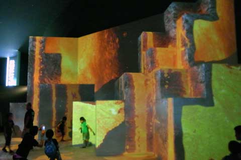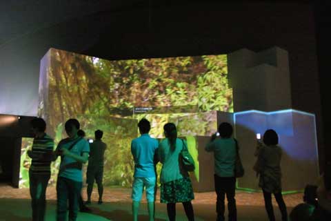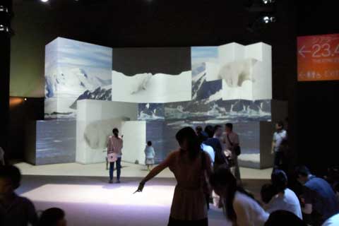 その他は、それぞれ別々のテーマで分かれている部屋(パンフにはエキシビションと書いてあります)に入って6~10分程度の映像鑑賞をする仕組みです。強制的に、23.4というエキシビションだけ席と時間を予約させられますが、他は自由です。我々夫婦は23.4の他は、待つ事無く入れた数カ所だけしか入りませんでした。何故かって、概ねその他のエキシビションは30分待ちだった訳で、全部回ってたら・・・・・と言う事です(爆)