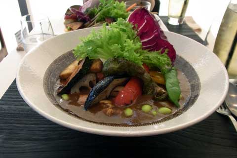 奥様の用事が本当に昼だったので、それが終わってから昼飯と言う事にしていました。食い物に重点を置いていた訳では無いので、お目当ての施設があるビルで食べることに。で、普通に食えるモノはつまらないかなぁ~と思い、「むかしみらいご飯」(だったかなぁ?)という所を選びました。オーガニック押し、と言いますか野菜中心と言いますか、何はともあれヘルシーが売りでした。でもね、俺が選んだのはコレ↓ カレーです(笑)。