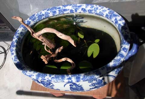 さてさて投入した真の理由はといえば、睡蓮と藻は生きていたので水を張りっぱなしにして放置していた睡蓮鉢に、謎の水生生物(丸い様な形状で素早い動きを見せますが、小さすぎて何なのか分かりません)が大量発生していたからです(笑)。オマケにボウフラの抜け殻も多数・・・。リセットしても良かったんですが、藻と睡蓮が元気だったので止めて、食物連鎖に任せる事にしたのです。