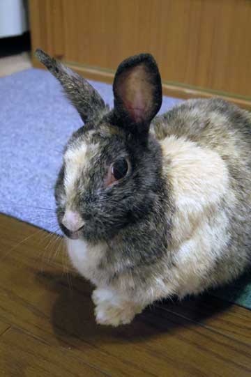 確かハリネズミを診せに行っていた時だったと思いますが、帰り際に「里親募集中なんだけど、このウサギどう?」と紹介されたのがキッカケでした。最初に飼っていたウサギが☆になった後、ショックで(奥様は)ウサギを飼おうとはナカナカ思えなかったようで、最初は「飼うのはチョット・・・」と引き気味でした。そして通院最期の時にやっと飼うことに決めた子でした。