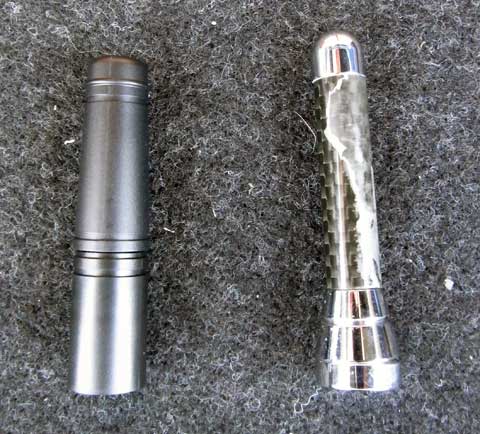 右側が駄目になったアンテナぁ…。何とも見窄らしい感じですよね。と言う事で、見た目の綺麗な感じよりも樹脂のみのツルンとした外観の左側のアンテナを購入しました。一応機能性も考慮しつつ、ヘリカルコイル内蔵としては最短と謳っていたアンテナをチョイスしました。が…なんだかアダプターが長くて(下側の約1/3部分がアダプタなんですぅ)、旧品と然程変わらない全長になってしまいました(爆)