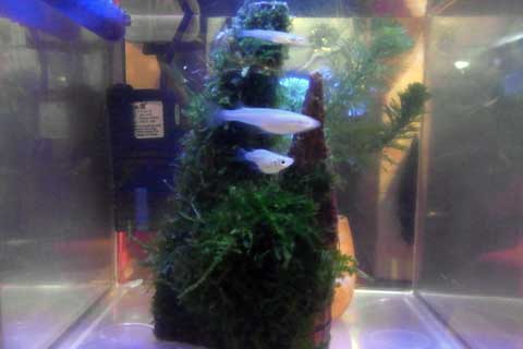 そして・・・小型水槽用ライトが無かったんでこの水槽に付けてなかったんですが、さすがに暗すぎるかなぁ・・と言う事で付けることにしました。LEDにしたかったんですが、微妙に高くて安売りしてた蛍光灯仕様を買って来ました。買ったライトは少々大きめであったため、フグ水槽に取付け。玉突きでフグ水槽に付けていたLEDライトをメダカ水槽に移設しました。そして丁度「青めだか」が売っていていたので、ついでに!?5匹ほど増量してみました(爆)