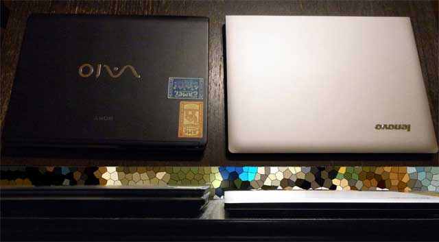 モニターサイズはどちらも同じ『13.3inc』ですが、新しい方が若干大きいですね。画面の縦横比の違いが第一要因だと思いますが、それだけでは無くて玲野歩さんには小さく作る気が無いだけに感じます(笑)。しかし、厚さは倍くらい違うし(薄くなったし)、重さも大分軽くなりました。その分というか何というか…今回のマシンはDiskドライブが内蔵されていません。まぁ、無いと何かと不便なので、USB接続の外付けドライブを同時購入しました。勿論(?)、BD読み書き対応品です(爆)。それでも、これが5K円チョットと安いんですよ。添付ソフトは皆無でしたが、今やフリーソフトでも何とかなるので、良しとしました。