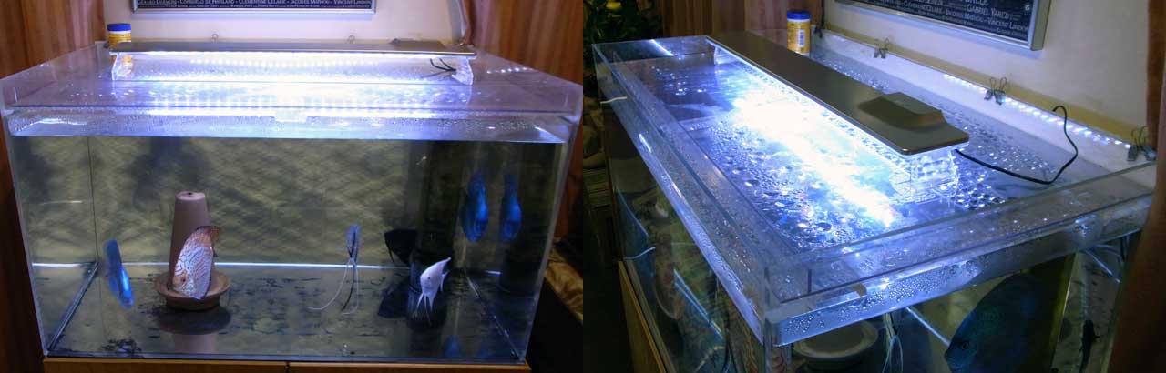 それでどうしたかと言うと、ディスカス水槽に使い始めた新しいLEDライトを120cm水槽に移設。ディスカス水槽には従来の蛍光灯2灯式ライトは使わず、新たにLEDライトを購入しました・・・(笑)。その理由は、これまた運良く?(悪く…かしら??)、行きつけのペットショップにてWebで物色するよりも安い価格で60cm用のLEDライトが特売されていたからでした(爆)。