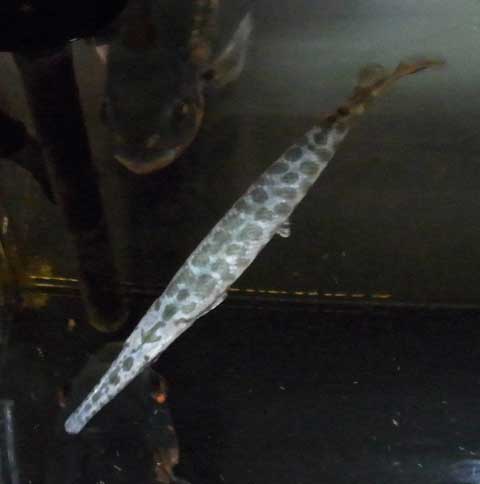 凄い受け口で、凄く薄っぺらいでしょ?(笑) これがこの魚の体型の特徴です。この変わった体型に惹かれて飼ったんです。最近なんですよ、写真が撮りやすくなったの。基本的に臆病なので、全体がフレームに入る良い感じの場所まで今まで中々出てきてくれなかったんです。今でも近寄ればササーっと逃げてしまいますが、暫くするとユックリと出てきてくれるんです。観察できないと健康状態の把握にも苦労するので、出てきてくれるのはイイコトです。