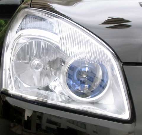 ハイビームのバルブを高輝度仕様(4800K @HID化はせず、ハロゲンのままです)に換えてみました。バルブが青いんで、リフレクター内にその色が反射して青くなっています。超自動後退で安売り&キャンペーンがあったので購入しました(ポイントだけで買えたので、実質0円!)。これでロービーム&フォグの白さに近づいたので(下の写真を見て下され)満足してます。
