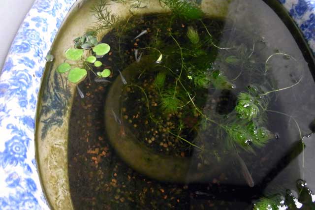 水温が低いと水草は生きていけません。暖かいうちに育っていた水草は、冬の間に腐ってしまします。で、その残骸が残っているわけですが、私が毎年、G.W.に掃除をかねて睡蓮鉢の環境をリセットしていました。今年もそろそろね・・・と思っていた矢先、唐突に『水草が欲しいんだけど』と奥様が言うではありませんか。なんで?と聞くと『腐ってた水草と藻を掃除したから』とのことで・・・。鉢に水を入れているだけですから、水草が無いと水中に酸素が供給されません。考え込んでも意味が無いのでその日のうちに買ってきました。で、中の掃除はしないまま水草を投入。今年は掃除しない事にしました。